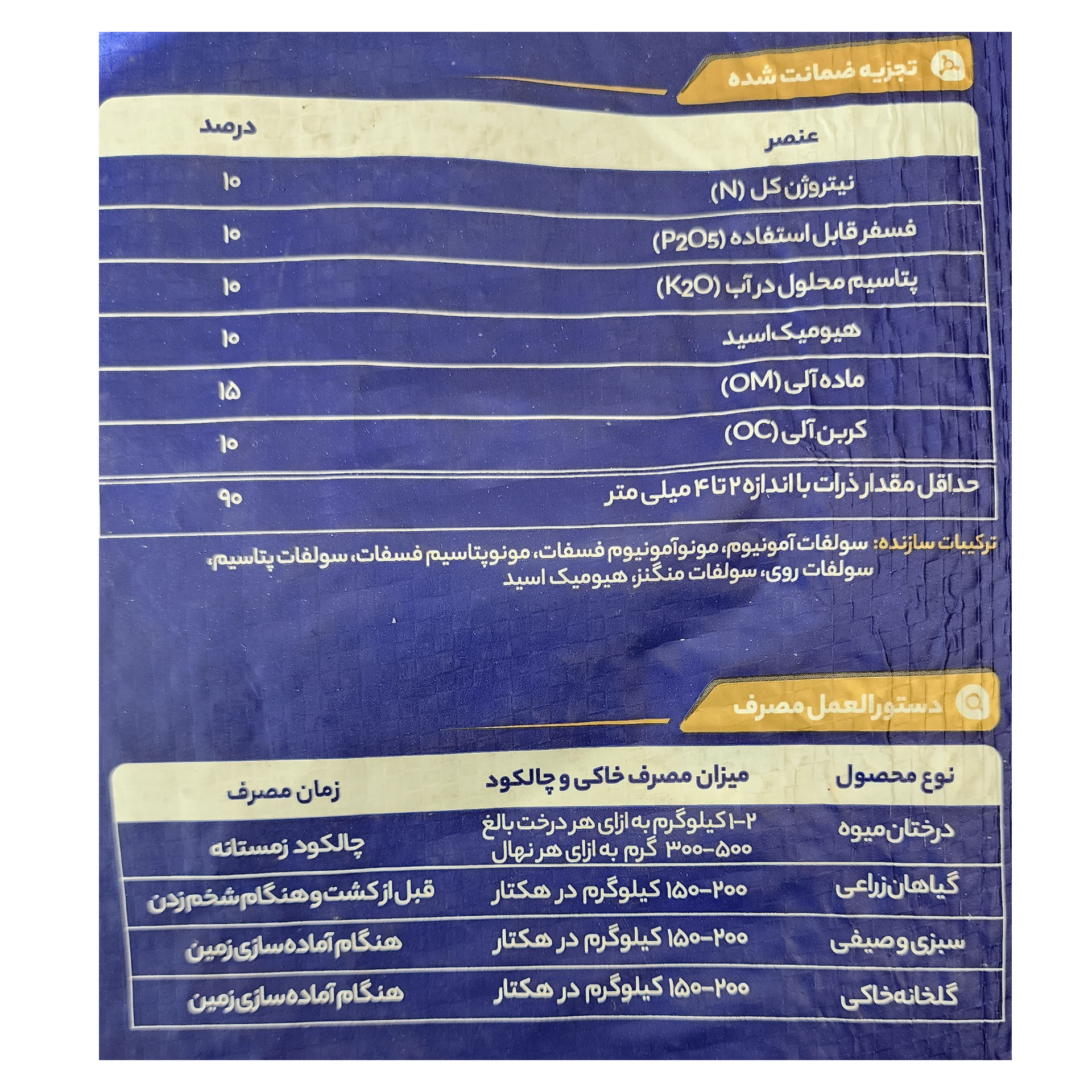 این محصول حاوی 11 درصد هیومیک اسید، 10 درصد ازت، 10 درصد فسفر و 10 درصد پتاسیم می باشد.