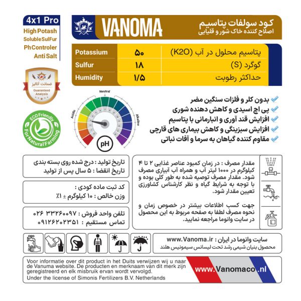سولفات پتاسیم وانوما یک ترکیب کودی، حاوی دو عنصر پتاسیم و گوگرد است. این کود به دلیل داشتن مقادیر بالایی از پتاسیم، در بسیاری از فرایندهای زیستی، تاثیرات قابل توجه به جای میگذارد که شاید مهمترین آن درشت شدن و رنگ آوری بهتر میوه ها حین رسیدن است. این کود در تمام فصول قابلیت استفاده دارد اما زمان طلایی استفاده از آن در باغات و مزارع، انتهای فصل و نزدیک به فصل برداشت است. گوگرد موجود در این کود نیز به خواص پتاسیم افزوده و سبب رنگ گیری بهتر محصول می شود، ضمن اینکه گوگرد خاصیت اصلاح کنندگی خاک و نیز خواص ضد عفونی کنندگی نیز دارد. سولوپتاس (نام دیگر سولفات پتاسیم بین کشاورزان) وانوما، کاملا در آب محلول بوده و مناسب برای سیستم های آبیاری تحت فشار است. امکان استفاده از این کود به دو شکل آبیاری یا محلولپاشی وجود دارد و همچنین به خاطر کلر بسیار پایینی که دارد، برای تهیه استوک های غذایی کشت هیدروپونیک نیز توصیه می شود.